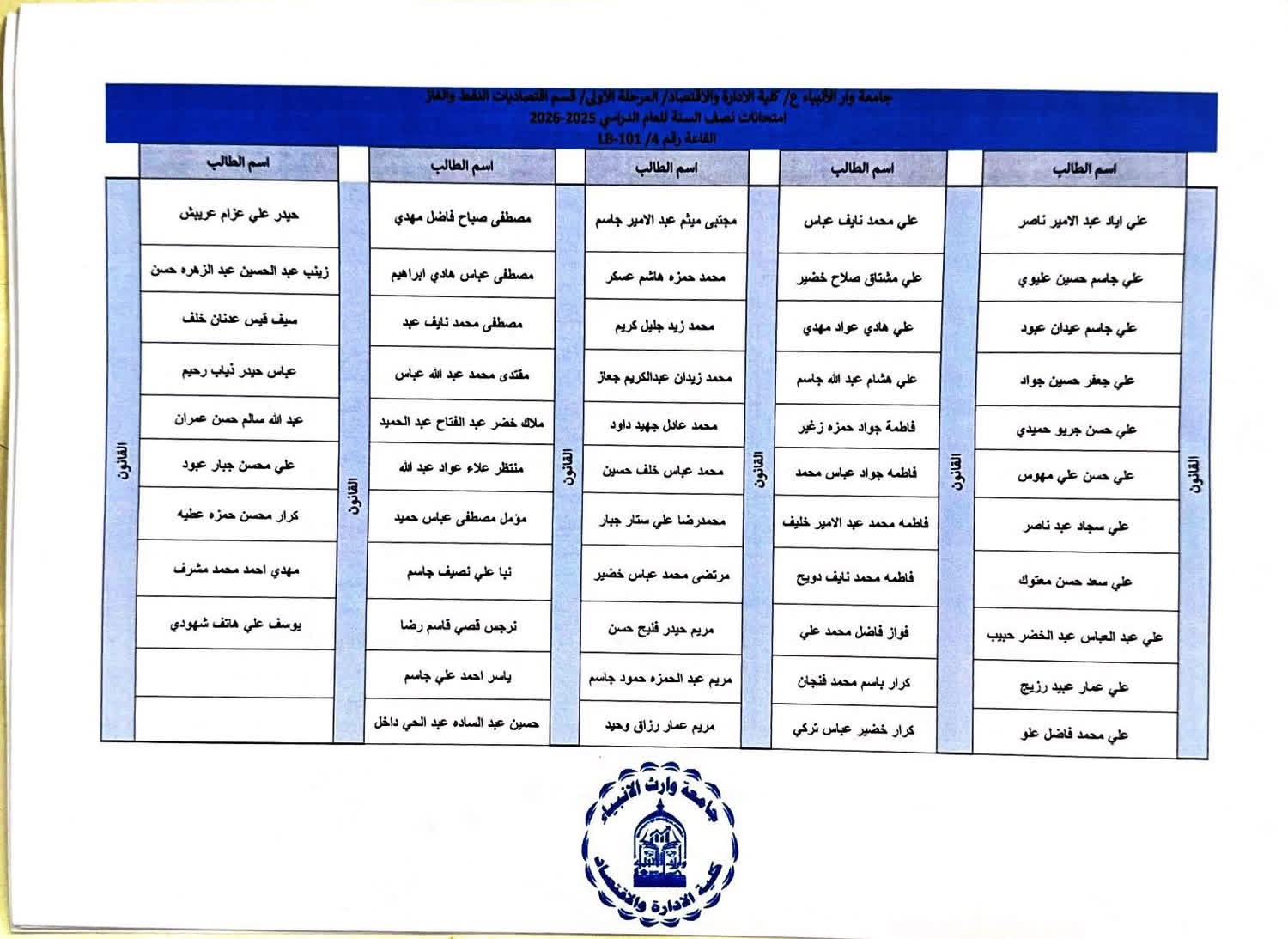 خرائط الجلوس الخاصة بالقاعات الامتحانية للمرحلة الاولى ولكافة اقسام الكلية