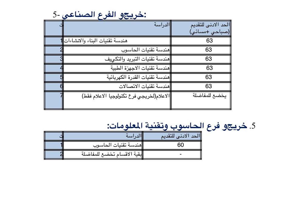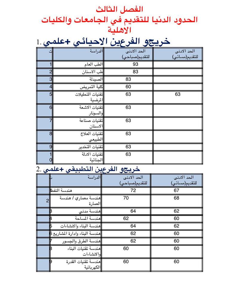 ادناه معدلات القبول بعد التخفيض حسب قوائم الوزارة