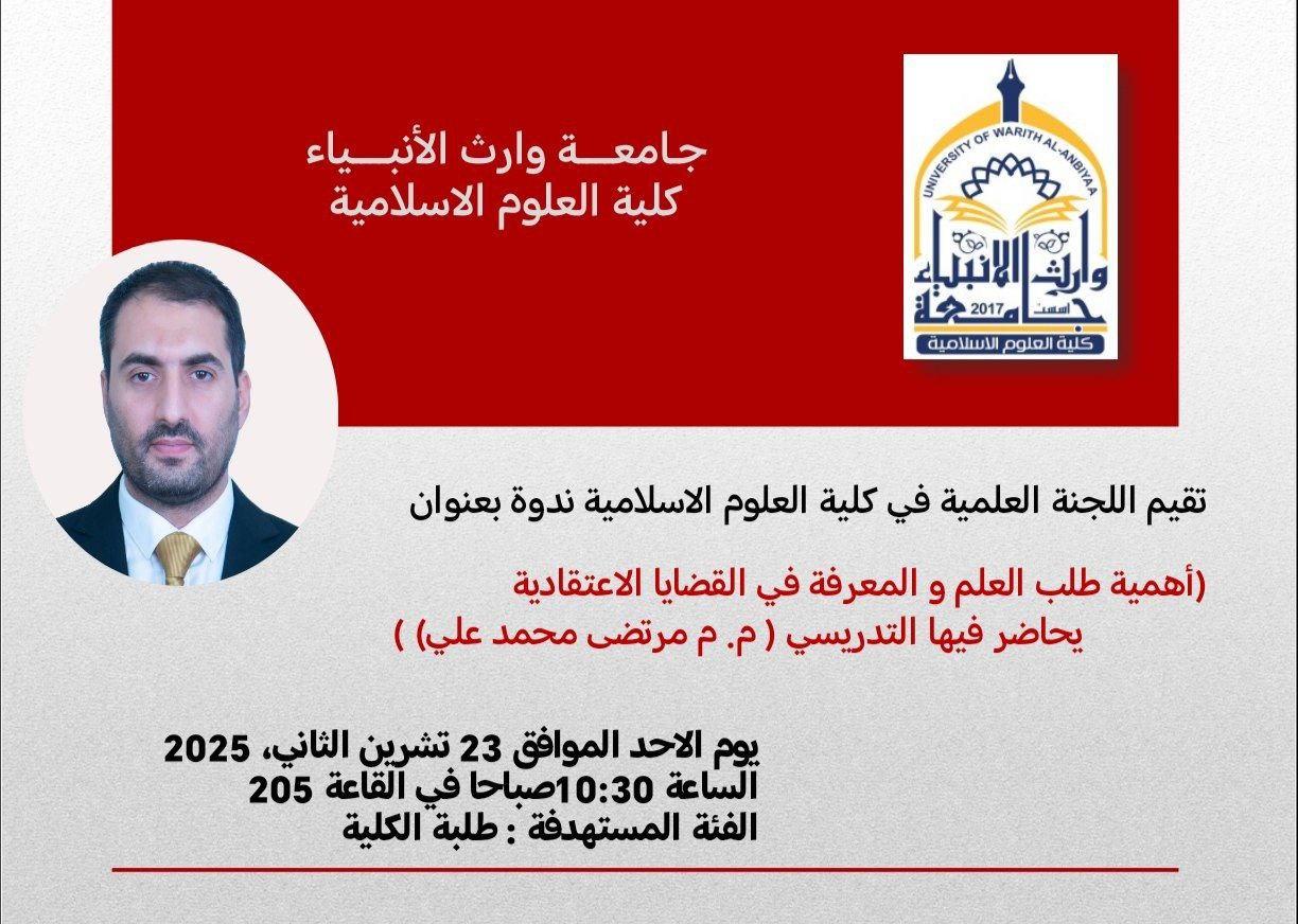 تدعو كلية العلوم الإسلامية في جامعة وارث الأنبياء (ع) طلبتها الأعزاء إلى حضور الندوة العلمية الموسومة: