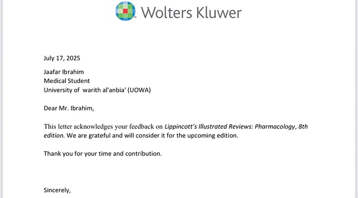 كرّم السيد عميد كلية الطب في جامعة وارث الأنبياء (ع) الأستاذ الدكتور علي عبد سعدون الغزي الطالب جعفر إبراهيم دخيل مطر ، ومنحه كتاب شكر وتقدير من السيد رئيس الجامعة الأستاذ الدكتور إبراهيم سعيد الحياوي إضافةً إلى مكافأة مالية تقديراً لجهوده العلمية المتميزة.وجاء هذا التكريم بعد أن وجّه الطالب رسالة رسمية إلى دار النشر العالمية (Wolters Kluwer) بخصوص ملاحظة علمية دقيقة في كتابLippincott’s Illustrated Reviews: Pharmacology – 8th Edition،تتعلق بتوصيف أدوية MAOIs في الصفحتين (141 و185).وقد تم قبول الملاحظة والاعتراف بصحتها من قبل الجهة الناشرةوهو إنجاز علمي متميز يعكس كفاءة طلبة كلية الطب في جامعة وارث الأنبياء (ع) وحرصهم على الدقة والتميز الأكاديمي