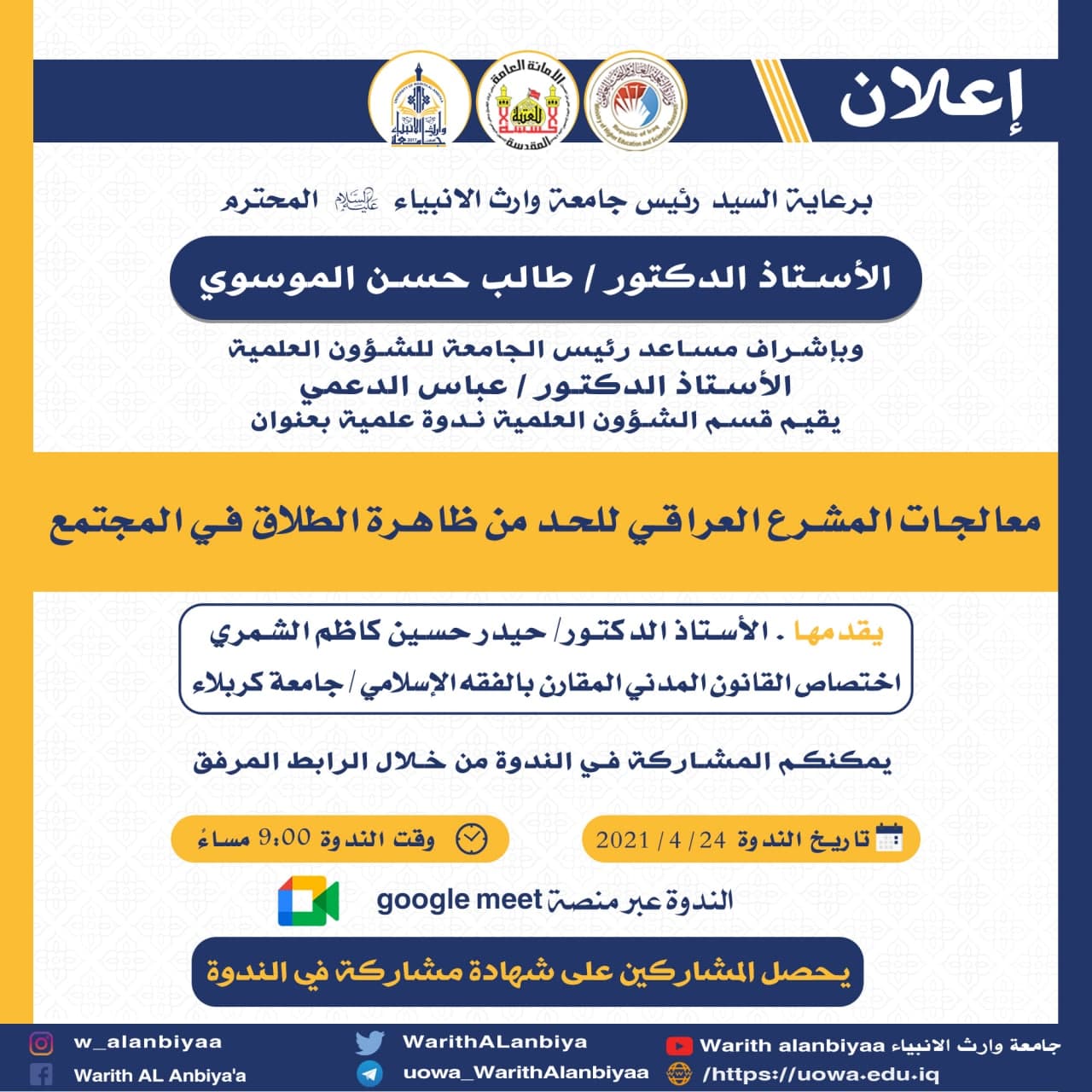 يقيم قسم الشؤون العلمية في جامعة وارث الانبياء(عليه السلام) ندوة علمية إلكترونية عبر منصه كوكل ميت (google meet)ومن خلال الرابط أدناه: meet.google.com/zdu-hvkc-rkk