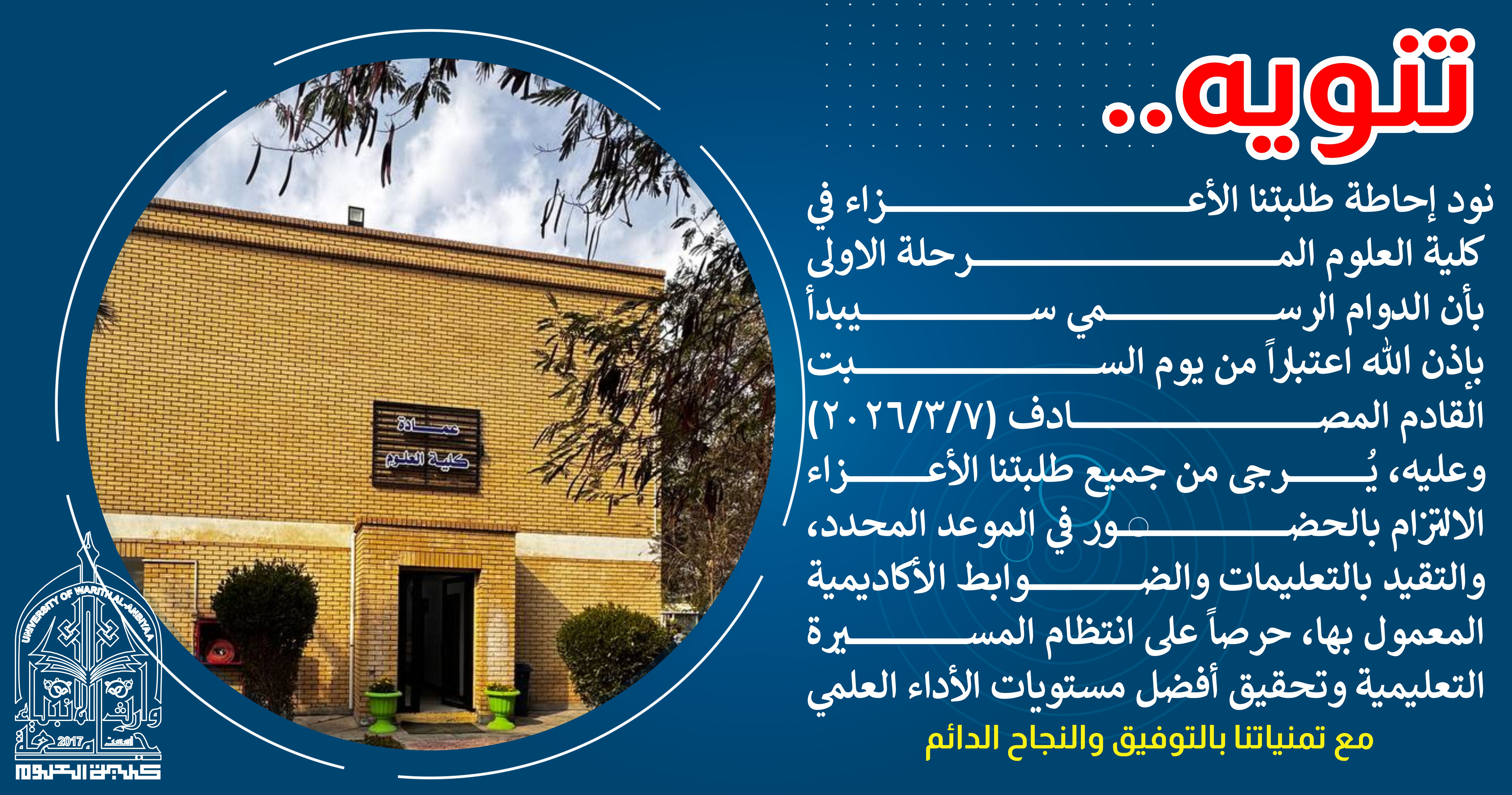 نود إحاطة طلبتنا الأعزاء في كلية العلوم المرحلة الاولى بأن الدوام الرسمي سيبدأ بإذن الله اعتباراً من يوم السبت القادم المصادف (2026/3/7)وعليه، يُرجى من جميع طلبتنا الأعزاء الالتزام بالحضور في الموعد المحدد،والتقيد بالتعليمات والضوابط الأكاديمية المعمول بها، حرصاً على انتظام المسيرة التعليمية وتحقيق أفضل مستويات الأداء العلميمع تمنياتنا بالتوفيق والنجاح الدائم...