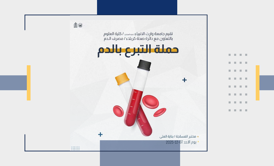 تقيم كلية العلوم في جامعة وارث الانبياء (عليه السلام) بالتعاون مع دائرة صحة كربلاء،حملة للتبرع بالدم في يوم الاحد الموافق 7/12/2025بناية العُلى / مختبر الفسلجة.والدعوة عامة للجميع