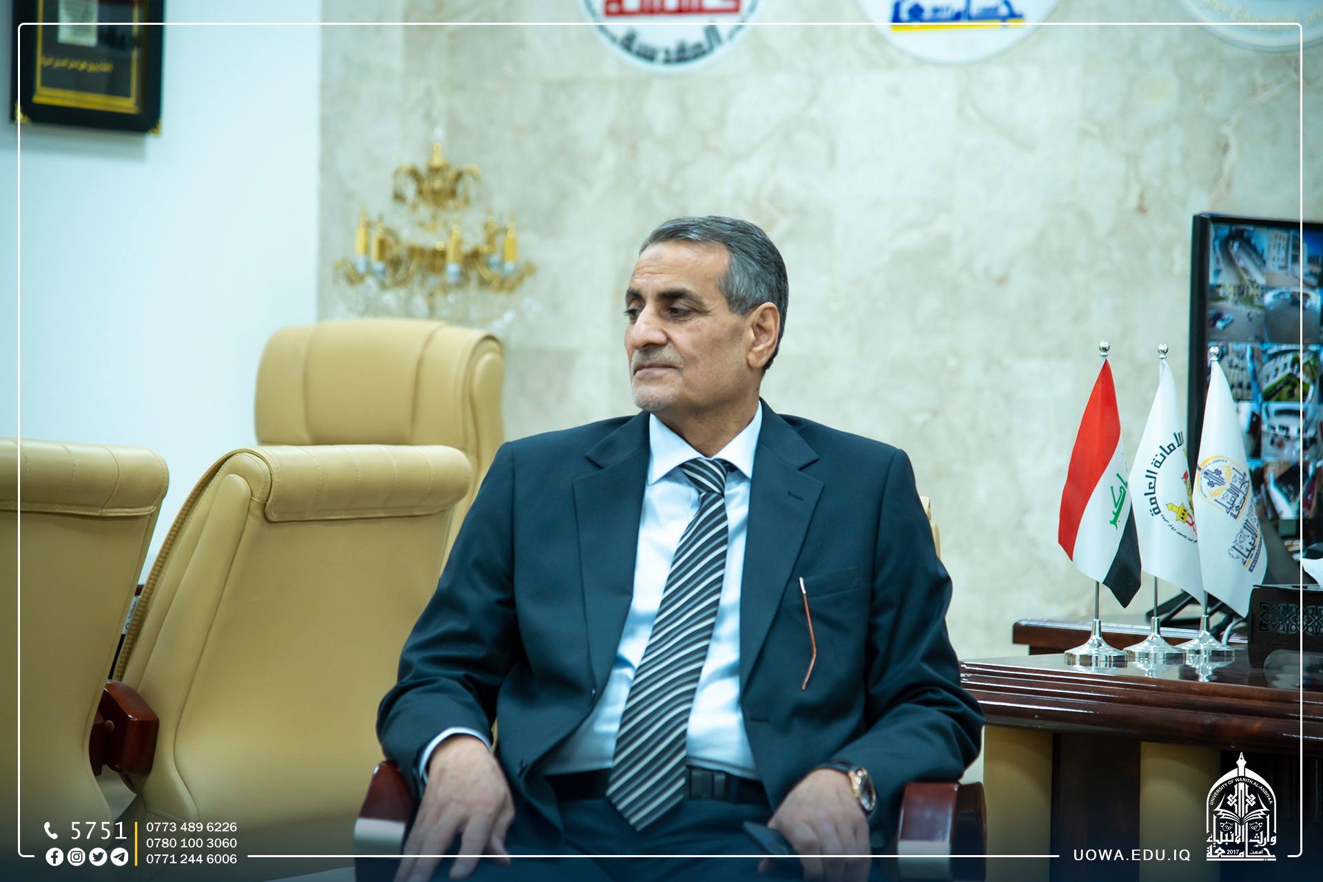 The University President, Professor Dr. Ibrahim Al-Hayawi, received a delegation from the College of Medicine at the University of Baghdad, led by the Dean of the College, Assistant Professor Dr. Ameen Abdul Hassan Al-Alwani. This visit was conducted to discuss the ways and possibilities of scientific cooperation between the College of Medicine at the University of Warith Al-Anbiyaa (peace be upon him) and the College of Medicine at the University of Baghdad in line with our university's vision and future aspirations to strengthen the educational process and benefit from the academic expertise that the College of Medicine at the University of Baghdad possesses to train and prepare our students. It is worth noting that the University of Warith Al-Anbiyaa (peace be upon him) is taking steps to keep up with the robust educational landscape by entering international rankings through partnerships and twinning with prestigious local, Arab, and international universities.