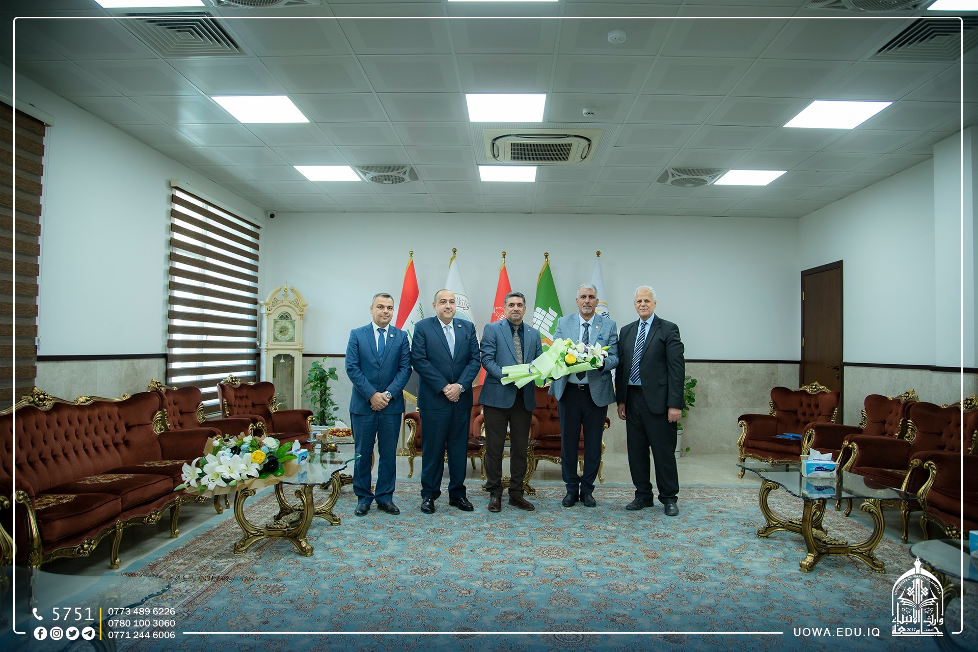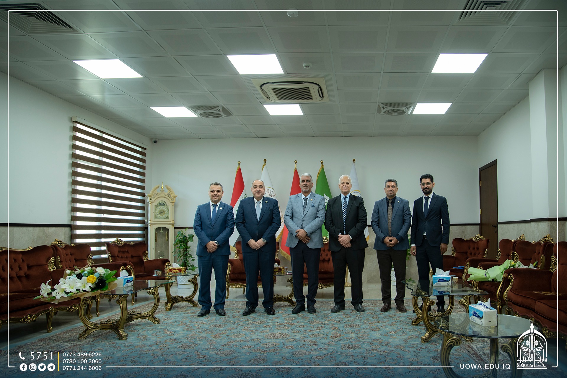 The President of the University, Professor Dr. Ibrahim Al-Hayawi, received the President of the University of Karbala, Professor Dr. Basim Khalil Al-Saadi, along with the Administrative Assistant, Professor Dr. Akram Al-Yasiri, who visited the university to offer congratulations and best wishes to Assistant Professor Dr. Hussein Hadi Hussein on the occasion of his appointment as the Dean of the College of Engineering. They prayed to Allah, the Almighty, for his success in serving the scientific journey in our dear country.