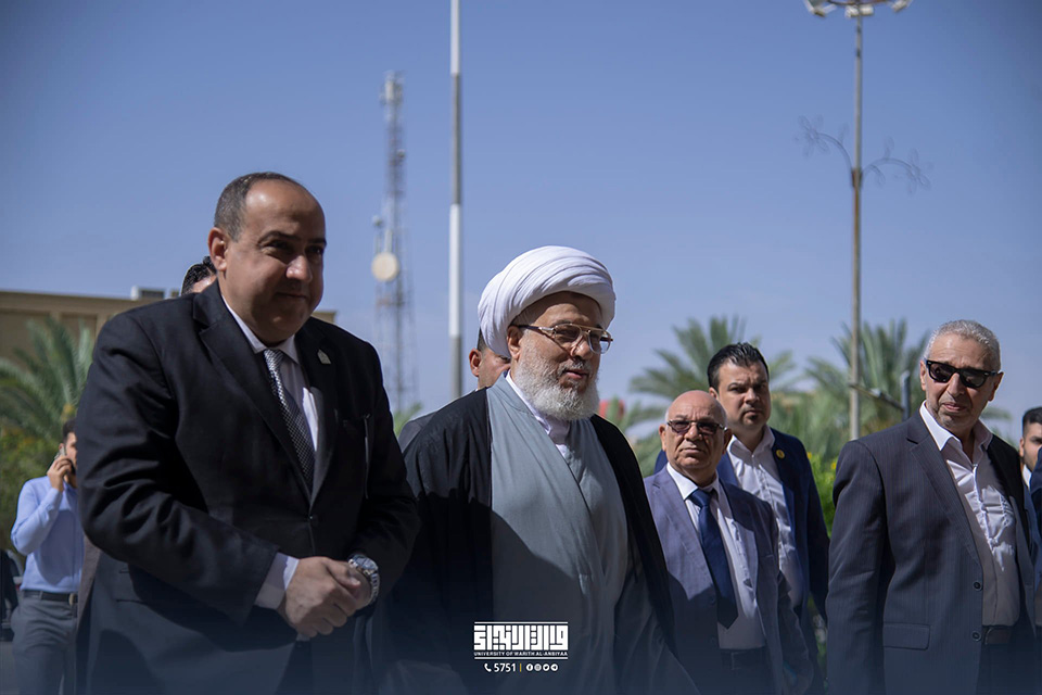 Warith Al-Anbiyaa University (PBUH) was honoured to host the Supreme Religious Authority's representative, His Eminence, the legal guardian of the Holy Shrine of Imam Hussein (PBUH), Sheikh Abdul Mahdi Al-Karbalai (may he always be honoured). The university's president, Professor Dr. Ibrahim Al-Hayawi, the administrative assistant, Professor Dr. Nofal Al-Araji, the scientific assistant, Professor Dr. Waqid Al-Mousawi, as well as college deans, received the dignitaries.