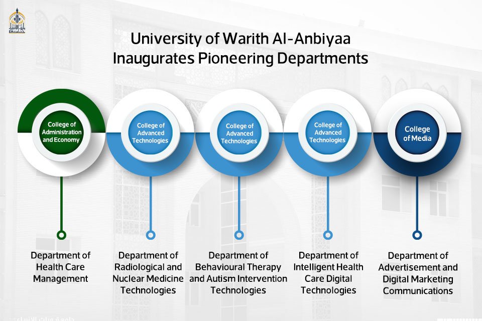The University of Warith Al-Anbiyaa (PBUH) has announced the establishment of five new academic departments, the first of their kind in Iraq, following official approval from the Ministry of Higher Education and Scientific Research.