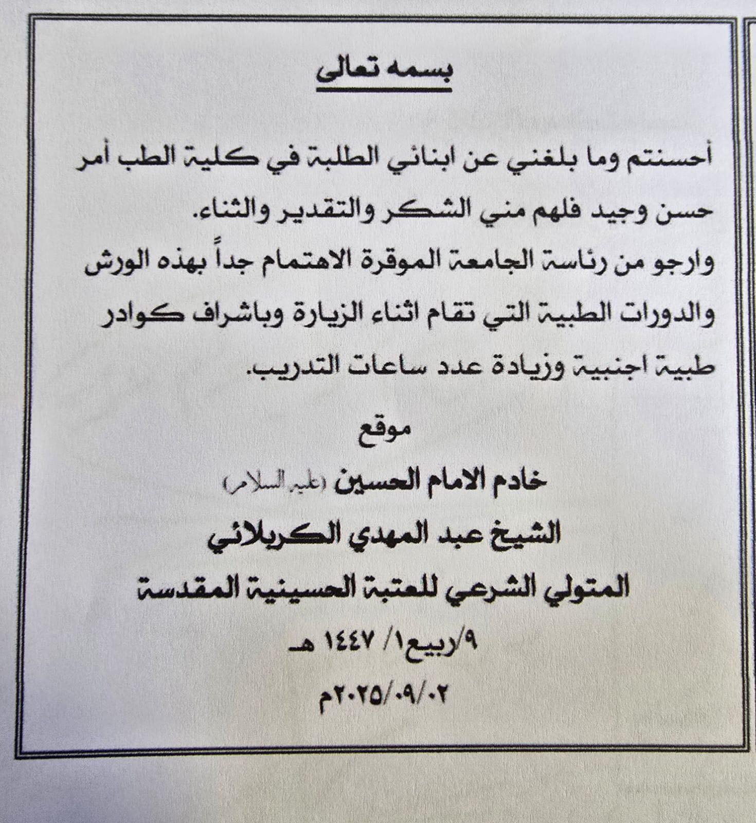 Through this step, the University of Warith Al-Anbiyaa reaffirms its commitment to expanding cooperation with Iraqi and international universities, fostering academic and research collaboration that contributes to community service and the advancement of higher education in Iraq.