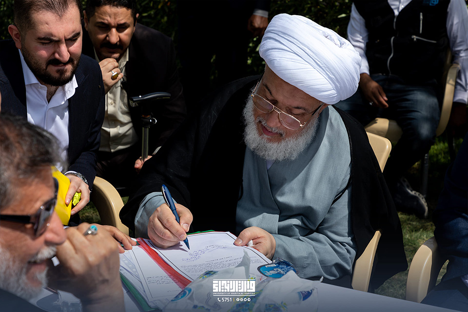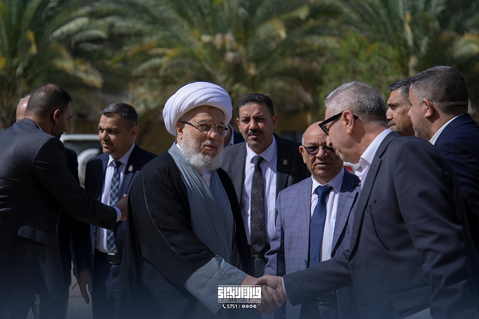 Warith Al-Anbiyaa University (PBUH) was honoured to host the Supreme Religious Authority's representative, His Eminence, the legal guardian of the Holy Shrine of Imam Hussein (PBUH), Sheikh Abdul Mahdi Al-Karbalai (may he always be honoured). The university's president, Professor Dr. Ibrahim Al-Hayawi, the administrative assistant, Professor Dr. Nofal Al-Araji, the scientific assistant, Professor Dr. Waqid Al-Mousawi, as well as college deans, received the dignitaries.