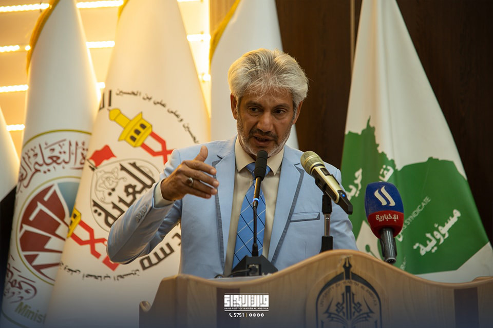 In the presence of His Excellency the Minister of Higher Education and Scientific Research, Dr. Naeem Al-Abboudi, the President of Warith Al-Anbiyaa University (peace be upon him), Professor Dr. Ibrahim Al-Hayawi, participated in the handover ceremony of the current session's presidency of the Arab Universities Union to the University of Baghdad. This event took place as part of the celebration of the sixtieth anniversary of the Union's establishment.