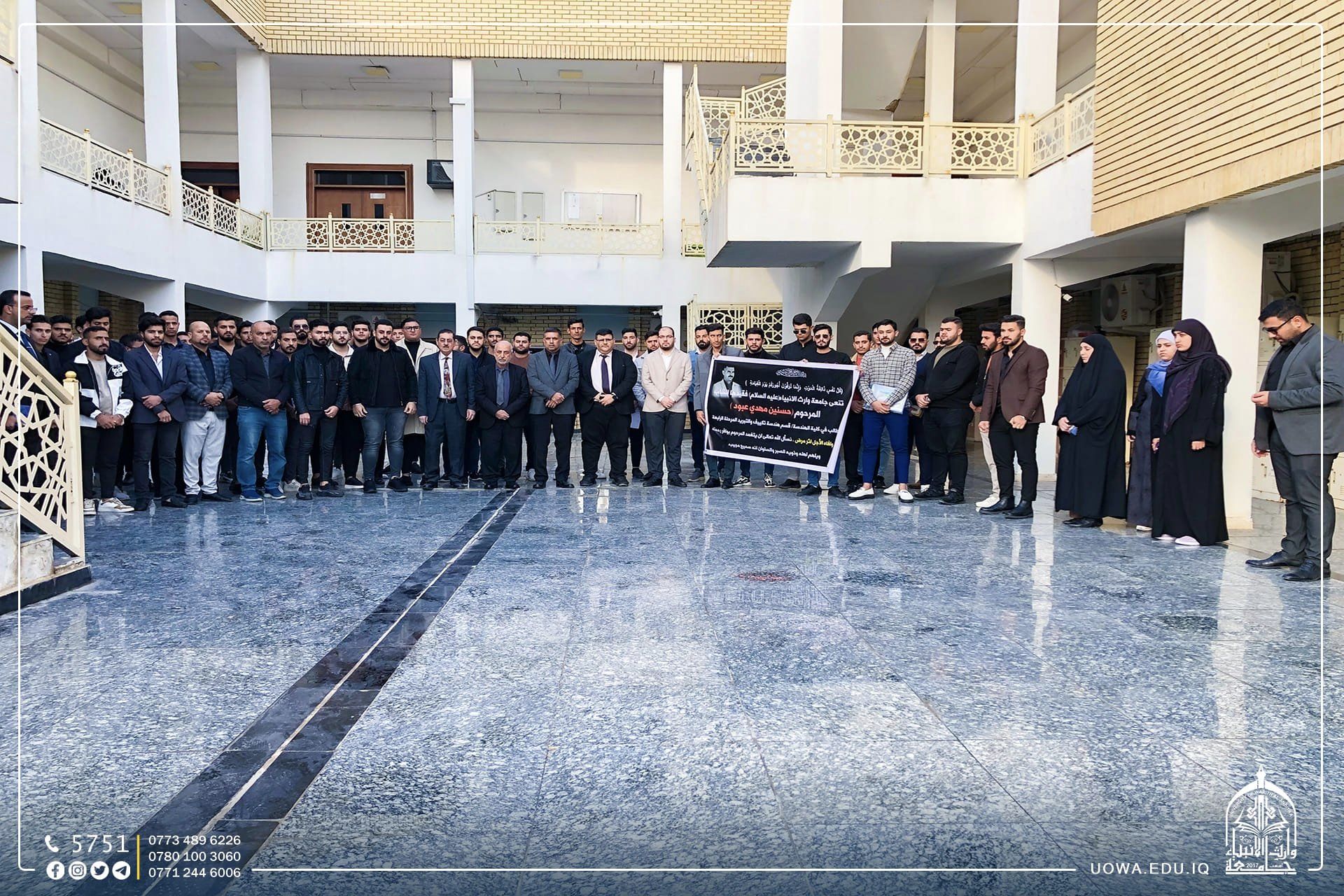 The College of Engineering at the University of Warith Al-Anbiyaa (peace be upon them) witnessed a touching mourning vigil. Faculty and students gathered to commemorate the soul of the virtuous young student, Hassanein Mahdi Aboud, who was studying in the Department of Air Conditioning and Refrigeration Technologies in the fourth stage.
