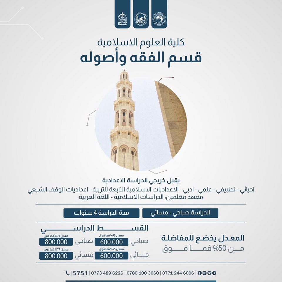 In line with the approach of the Holy Shrine of Imam Hussain and the directives of His Eminence the Religious Authority Sheikh Abdul-Mehdi Al-Karbalai (may his glory be perpetuated) towards seeking constructive cooperation and achieving effective contributions between the university and society, the University of Warith Al-Anbiyaa (peace be upon him) decided to exempt students applying to the College of Islamic Sciences - the first stage for the current academic year 2023-2024 - from tuition fees. This serves as an incentive for our conscious youth to pursue their educational dreams towards a promising future.