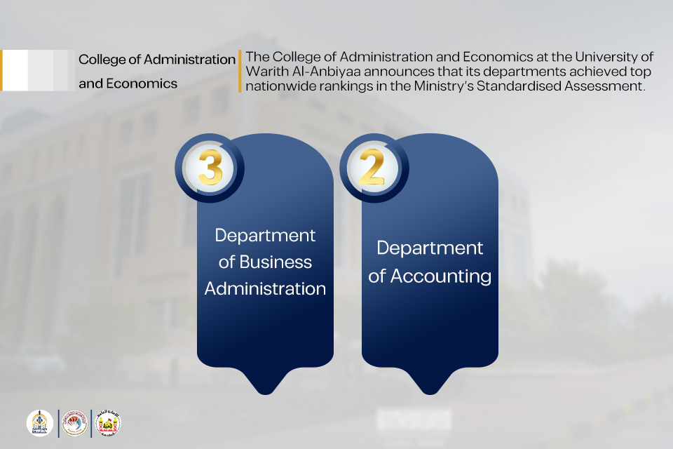 The College of Administration and Economics at the University of Warith Al-Anbiyaa has achieved a remarkable academic milestone, with several of its scientific departments securing advanced positions in the Ministerial Assessment Examination at the level of Iraqi universities. This accomplishment reflects the high quality of academic instruction and the continuous development of the College’s study programmes.